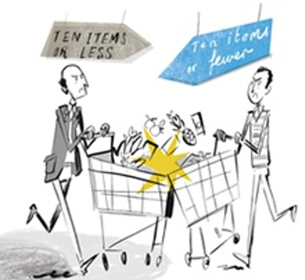 The small market in the village not far from us has been bullied into changing the express line sign to “Ten Items or Fewer,” but the large supermarkets have all steadfastly kept the “Ten Items or Less” sign. The large supermarkets probably have access to better grammatical advice and are pretty sure that the use of “less” in the sign will not confuse shoppers about just how many items they can take to the express line.